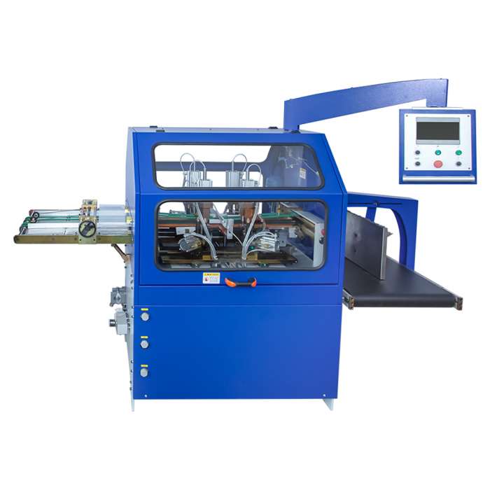 | HX60R Hardcover Case Corner Rounding Machine is connected to the hardcover case making machine, the finished hardcover cases are conveyed into the working area through the conveyor belt, then pressed and formed into round corners by the air cylinders and the heated press, and finally sent out to be stacked in batches with counting on the collecting table, after the corner rounding forming, the edge of the round corner is smooth and mellow. It is used to round corners of book cover, especially for hardcover books. |